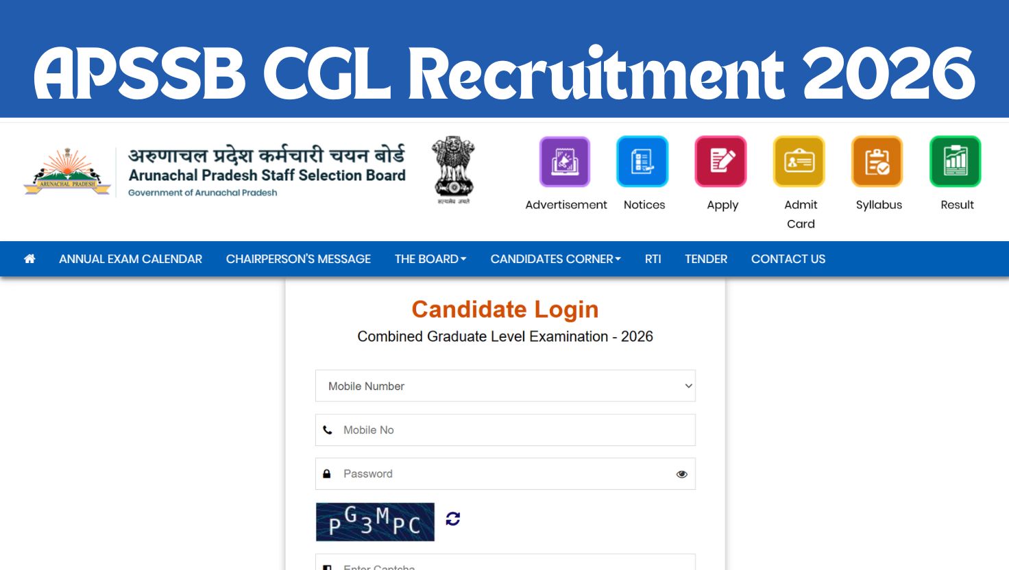 Candidates can apply online for APSSB CGL Recruitment 2026 through the official portal of the Arunachal Pradesh Staff Selection Board. The application process is completely online, and applicants are advised to complete the form well before the last date to avoid last-minute issues.