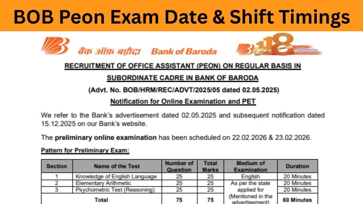 BOB Peon Exam Date 2026: Bank of Baroda has announced the exam dates for Office Assistant/ Peon posts on its official website, bankofbaroda.in. The Prelims exam is scheduled to be held on 22nd and 23rd February across designated exam centres in the country. The Bank of Baroda Peon Pre-examination Training (PET) is being held from 10 to 15 February.
