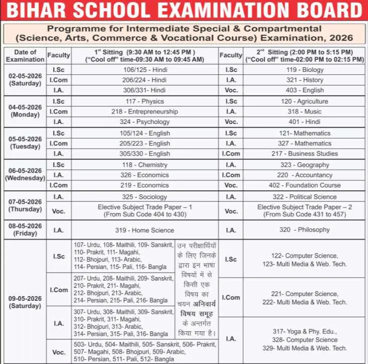 बिहार विद्यालय परीक्षा समिति द्वारा इन्टरमीडिएट विशेष परीक्षा, 2026 तथा इन्टरमीडिएट कम्पार्टमेन्टल परीक्षा, 2026 का परीक्षा कार्यक्रम जारी किया गया।#BSEB #BiharBoard #Bihar pic.twitter.com/8HmLmqc51A