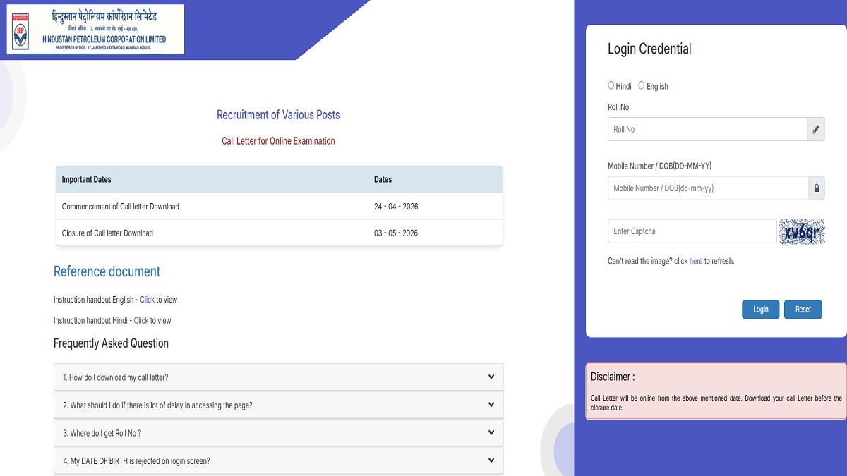 HPCL Officer Admit Card 2026: The Hindustan Petroleum Corporation Limited (HPCL) has released the admit card for the posts of Officer on its official website.Candidates can download their admit card after using their login credentials to the link at the official website The written exam for the Officer posts is scheduled to be held on May 03, 2026 across the country. The HPCL Officer Admit Card 2026 will be released shortly by the HPCl for the candidates applied for the Officers posts in different disciplines.