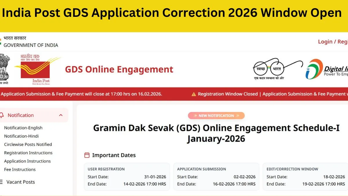 India Post GDS Application Correction 2026 link has been activated at the official website today, February 18. The Department of Posts, operating under the Ministry of Communications, will keep the application correction window open till February 19, 5 PM. Candidates who want to rectify their mistakes or update details in GDS application form can do so by visiting the official website, indiapost.gov.in.