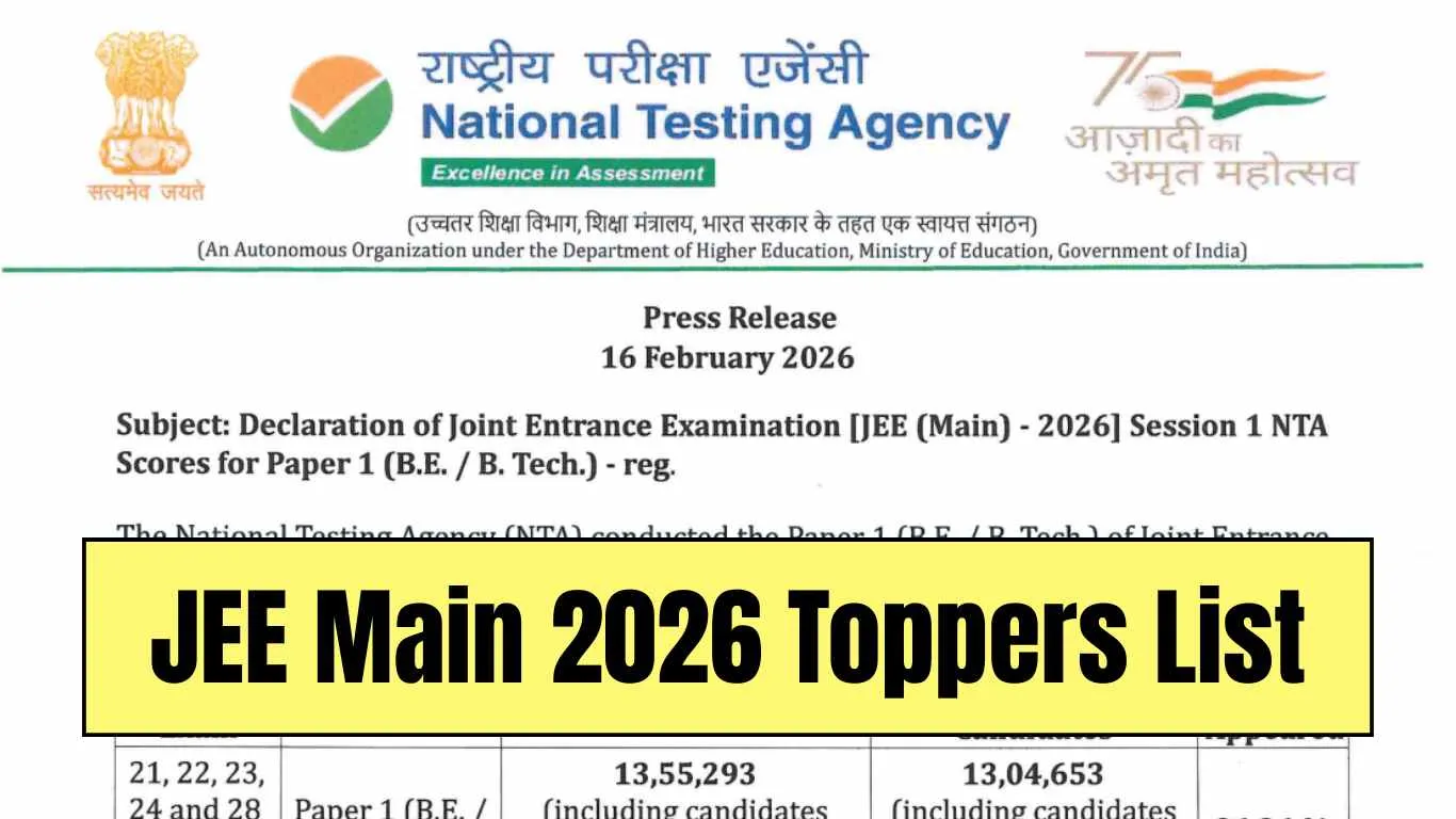 JEE Main 2026 Toppers: The National Testing Agency has released the JEE Main 2026 Session 1 result today, 16 February 2026. Along with the result, the list of JEE Main 2026 toppers has also been announced. A total of 12 students have secured a perfect 100th percentile, showcasing outstanding academic performance in one of India’s most competitive engineering entrance exams.
