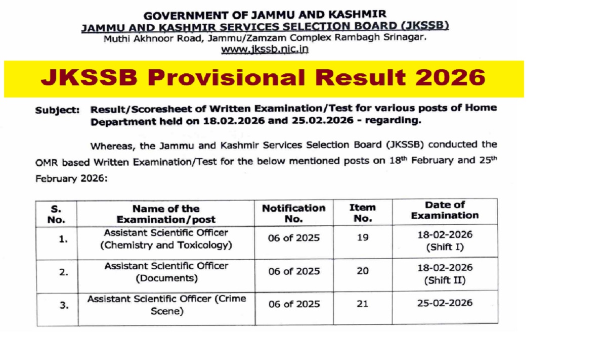 JKSSB Provisional Result 2026: The Jammu and Kashmir Service Selection Board (JKSSB) has uploaded the provisional results for Assistant Scientific Officer on its official website. The Board has published the Result/Score-sheet, based on the performance of candidates who appeared in the written examination for the Assistant Scientific Officer posts in different disciplines including Chemistry and Toxicology, Documents and Crime Scene. The result has been uploaded in PDF format containing the roll number of shortlisted candidates.