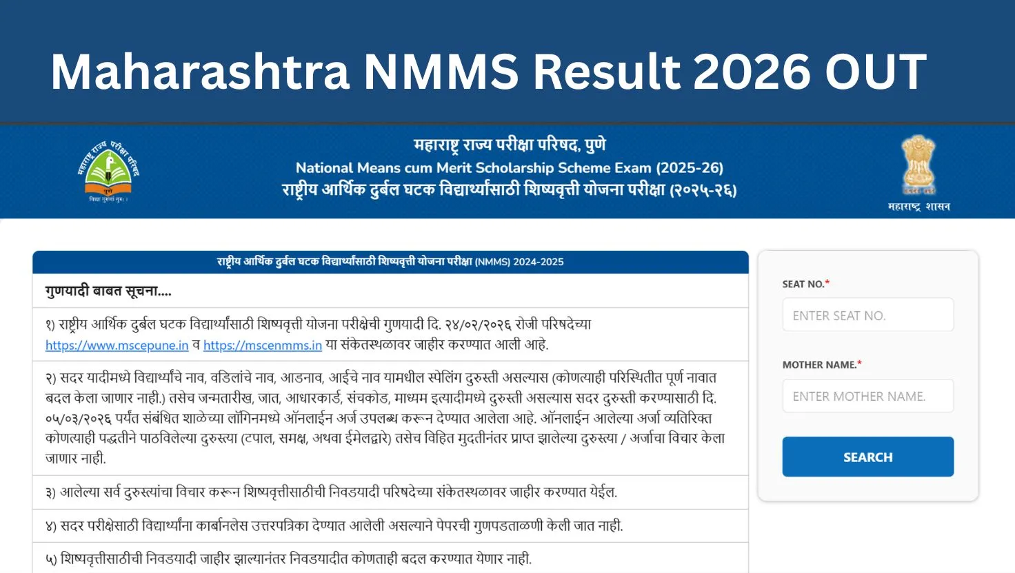 Maharashtra NMMS Result 2025: The National Means-cum-Merit Scholarship (NMMS) exam was held on 28 December 2025. The result for the Maharashtra NMMS exam has been announced on 24 February 2026 on the official website- mscepune.in. The merit list PDF consists of the list of candidates who are eligible for the scholarship. There is also the link for individual merit scores. The candidates can login by using their credentials and check their individual merit score. In this article, we are providing you all the relevant information and links about the Maharashtra NMMS Result 2026.