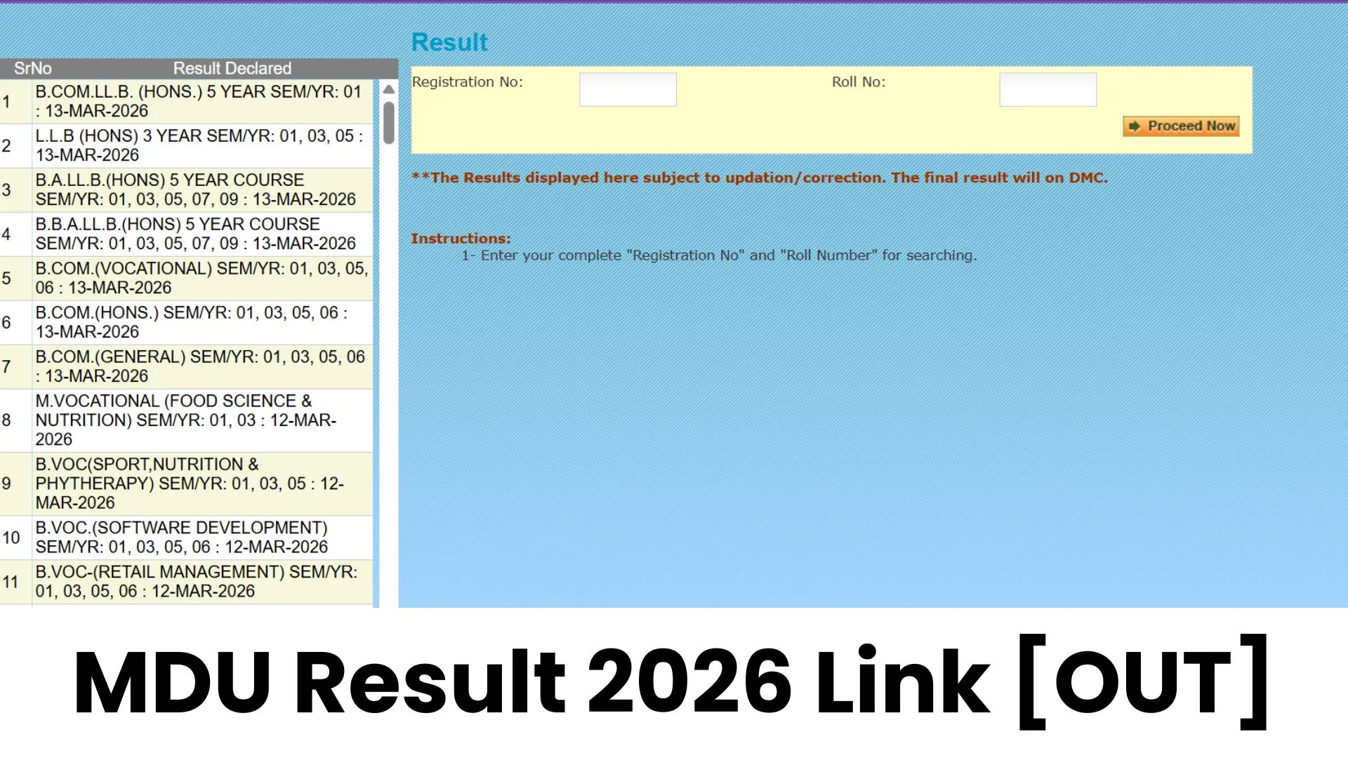 Maharshi Dayanand University Result 2026 OUT: महर्षि दयानंद यूनिवर्सिटी (MDU) ने विभिन्न UG और PG कोर्स के सेमेस्टर/वार्षिक परीक्षा परिणाम जारी कर दिए हैं। जिन छात्रों ने इन परीक्षाओं में हिस्सा लिया था, वे अब आधिकारिक वेबसाइट mdu.ac.in पर जाकर अपना रिजल्ट चेक कर सकते हैं। रिजल्ट देखने के लिए छात्रों को Roll Number या Registration Number दर्ज करना होगा। यूनिवर्सिटी ने B.Com, LL.B, BA LL.B, BBA LL.B, B.Voc और M.Voc समेत कई कोर्स के अलग-अलग सेमेस्टर के परिणाम जारी किए हैं। छात्र नीचे दिए गए कोर्स और सेमेस्टर के अनुसार अपना रिजल्ट देख सकते हैं।