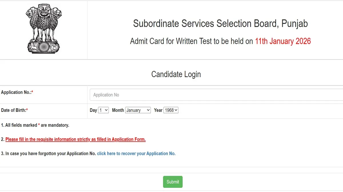 PSSSB Jail Warder Admit Card 2025: Punjab Subordinate Service Selection Board (PSSSB) has released the Admit Card 2025 for the written exam for the posts of Matron and Warder against Advt. No. 07 of 2025. The written exam is scheduled to be held on January 11, 2026 for various posts across the state. A total of 500 vacancies are to be filled for various posts including Jail Warders, Assistant Superintendents, and Matrons. Selection for these posts will be done on the basis of performance of candidates in various rounds including written Examination, PST/PMT and others. Candidates applied successfully for these posts can download their hall ticket through the link at the official website- sssb.punjab.gov.in.