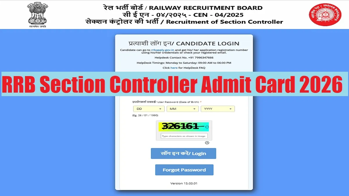 RRB Section Controller Admit Card 2026: The Railway Recruitment Board (RRB) has released the RRB Section Controller Admit Card 2026 on its official website. The written exam for the 368 Section Controller vacancies is scheduled to be held on 11th and 12th February 2026 across the country. Candidates can download the RRB Section Controller Admit Card 2026 after using their login credentials at the official website at rrbapply.gov.in.