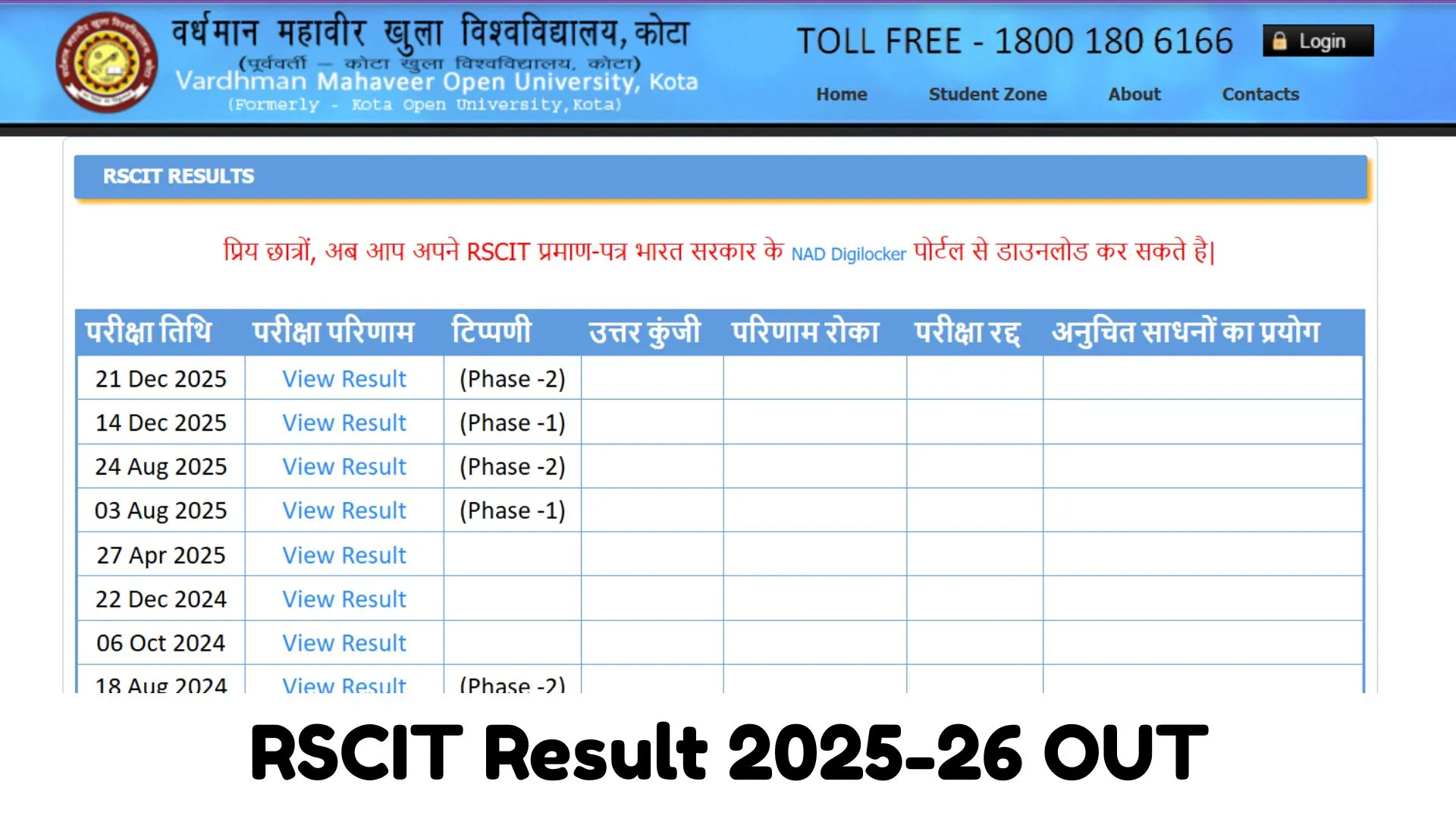 VMOU RSCIT Result 2025-26 OUT: वर्धमान महावीर खुला विश्वविद्यालय (VMOU) कोटा और राजस्थान नॉलेज कॉर्पोरेशन लिमिटेड (RKCL) ने RSCIT परीक्षा 2025 का रिजल्ट जारी कर दिया है। जिन उम्मीदवारों ने 14 दिसंबर और 21 दिसंबर 2025 को आयोजित राजस्थान स्टेट सर्टिफिकेट इन इन्फॉर्मेशन टेक्नोलॉजी (RSCIT) परीक्षा में भाग लिया था, वे अब अपना परिणाम आधिकारिक वेबसाइट rkcl.vmou.ac.in पर जाकर देख सकते हैं।