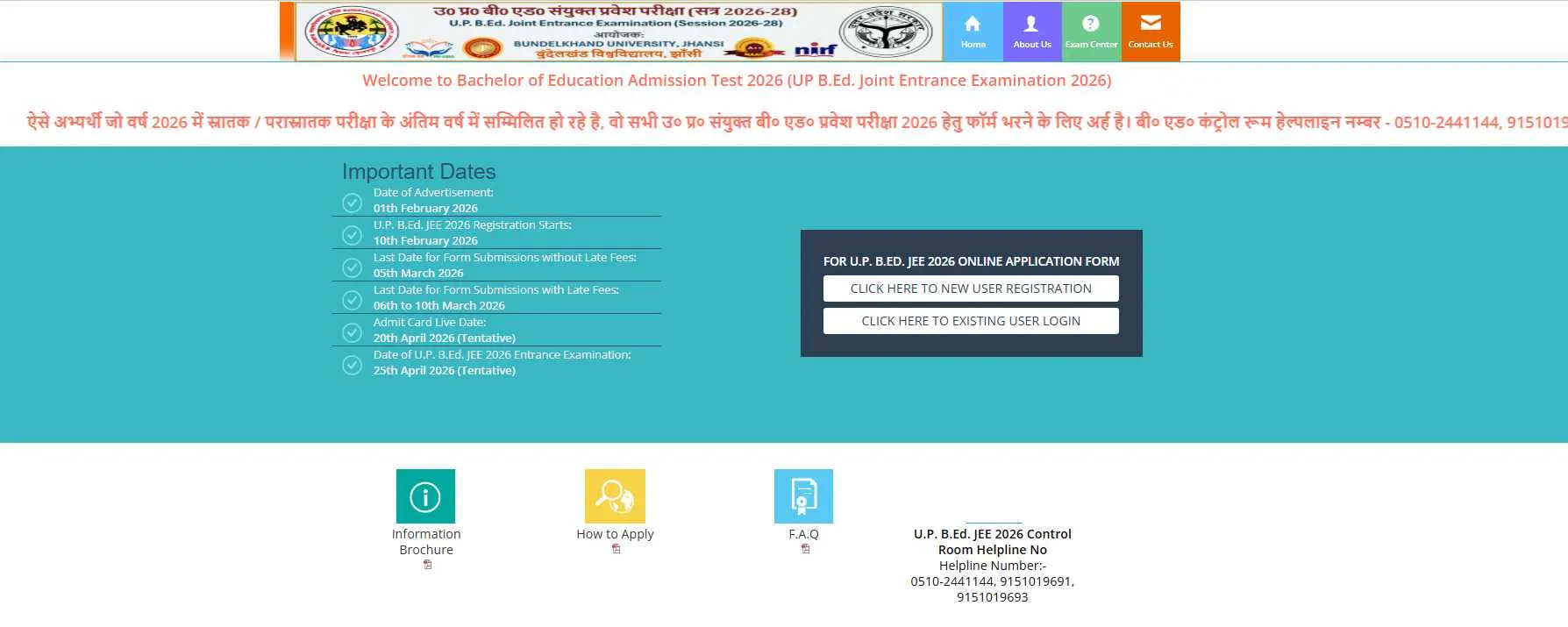 UP BEd Admission Form 2026: बुंदेलखंड यूनिवर्सिटी (BU Jhansi) ने यूपी बीएड जेईई (Joint Entrance Exam) के लिए ऑनलाइन आवेदन 10 फरवरी, 2026 से शुरू कर दिए गए हैं। भविष्य में टीचिंग में करियर बनाने के इच्छुक उम्मीदवार बीयू झांसी की ऑफिशियल वेबसाइट bujhansi.ac.in पर जाकर अपना आवेदन कर सकते हैं। इसी के साथ उम्मीदवारों को ध्यान देना चाहिए कि रजिस्ट्रेशन की अंतिम तिथि 5 मार्च तय की गई है, बिना लेट फीस के आवेदन पूरा करने की सलाह। जिसके बाद किसी भी उम्मीदवार के आवेदन स्वीकार नहीं किए जाएंगे। ऑनलाइन रजिस्ट्रेशन की प्रक्रिया, जरूरी डॉक्यूमेंट्स और आवेदन प्रक्रिया सहित विवरण जानने के लिए उम्मीदवार आगे लेख में देख सकते हैं।