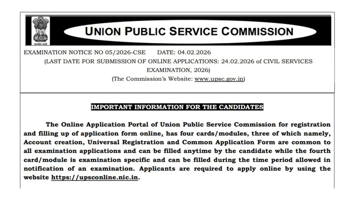 UPSC CSE Notification 2026: The Union Public Service Commission (UPSC) has released the Civil Services Examination (CSE) 2026 notification PDF today, February 4, 2026 at upsc.gov.in. The UPSC CSE Notification 2026 has been released to recruit eligible candidates for India's most prestigious services, including the Indian Administrative Service (IAS), Indian Police Service (IPS), and Indian Foreign Service (IFS). Interested and eligible candidates can apply online between February 2 and February 26, 2026.