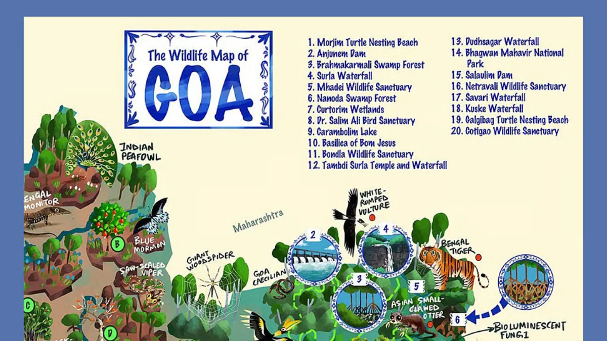 The map identifies 48 species that can be found in the various ecosystems of Goa such as birds, mammals, reptiles, marine species, mangroves and insects and some of the species are catfish, tigers, mangrove varieties like Rhizophora mucronata and Avicennia officinalis.