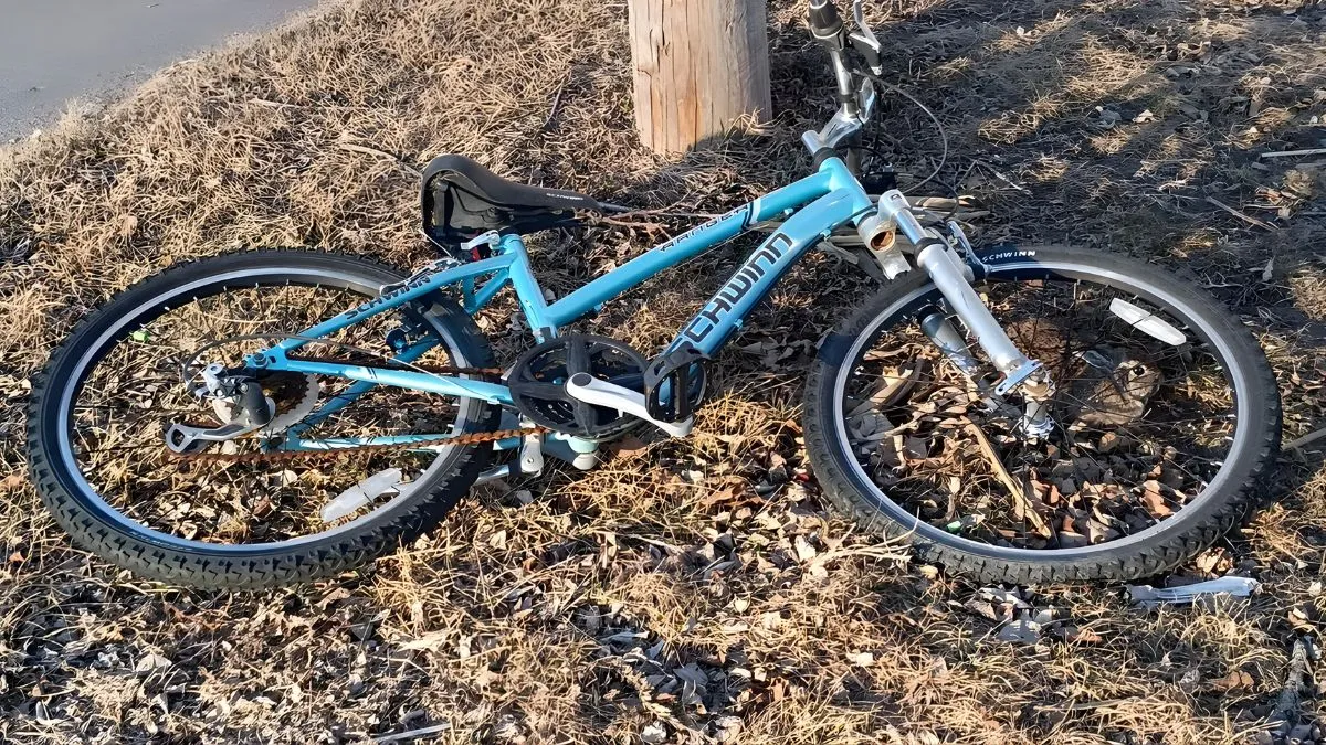There is a blue bicycle lying near the edge of a road on dry grass and fallen leaves. But here there is also a rabbit, which is hidden very cleverly- Can You See It?