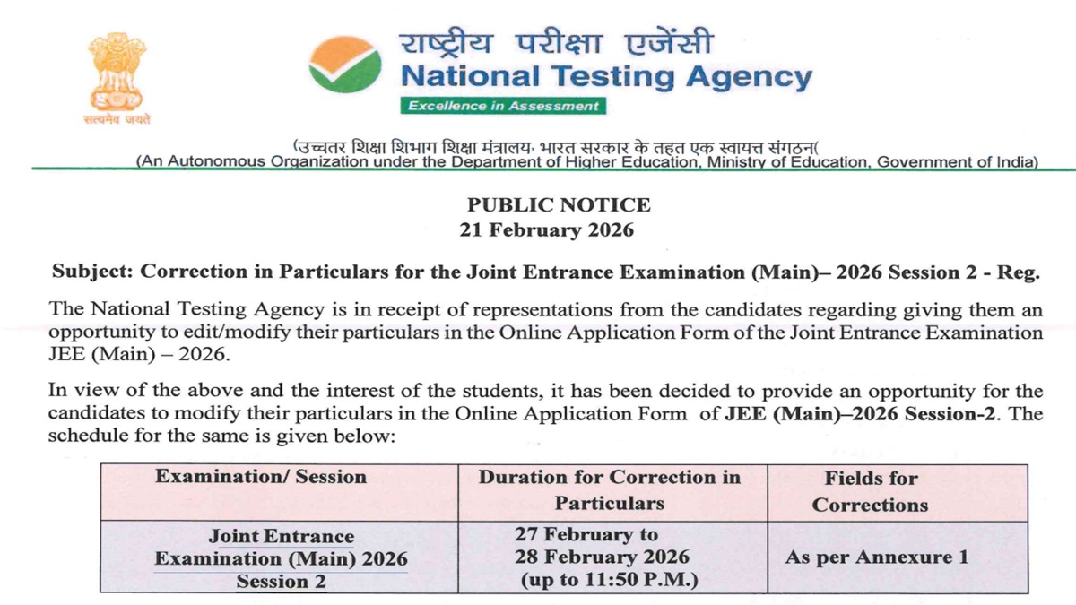 The National Testing Agency has announced the dates for the JEE Main 2026 session 2 application correction. The link for candidates to make changes to the session 2 applications will be available from February 27 to 28, 2026