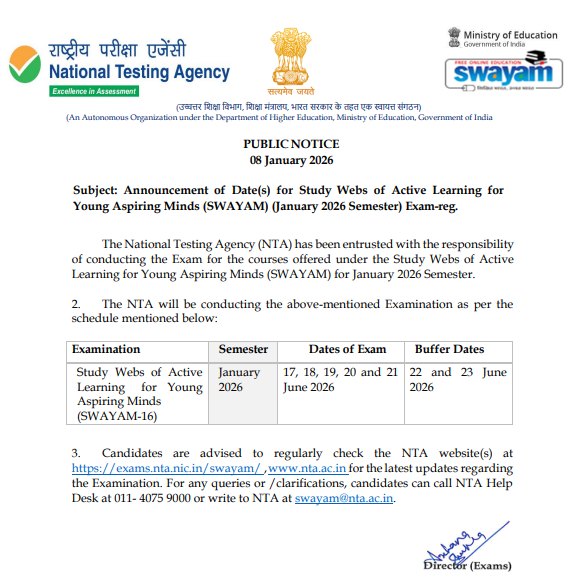NTA SWAYAM January 2026: नेशनल टेस्टिंग एजेंसी (NTA) ने SWAYAM जनवरी 2026 सेमेस्टर के एग्जाम का पूरा शेड्यूल जारी कर दिया है। एग्जाम में शामिल होने वाले छात्र ऑफिशियल वेबसाइट पर जाकर exams.nta.nic.in/swayam/ पर जाकर पूरे शेड्यूल को डाउनलोड कर सकते हैं।