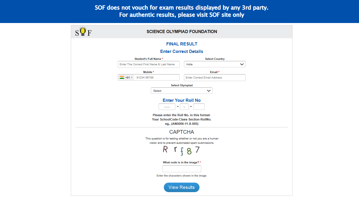 SOF will award cash prizes, medals, certificates, and scholarships to top-performing students, and appreciation certificates and recognitions will be given to schools, principals, and teachers for their contribution to student achievement. Results will be released in online mode which students can download from the website. SOF will contact the concerned individuals for award details and rank information. In case of any error or discrepancy, the student must contact their respective schools.